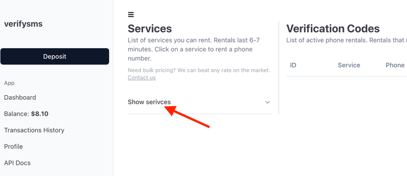 Now, log in to your VerifySMS account and, in the dashboard, click on “Show services”.