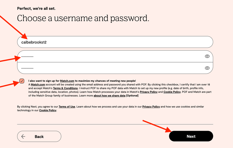 Now, create your username and password on Plenty of Fish. Check the box if you want to sign up for Match.com to maximize your chances of meeting new people.
