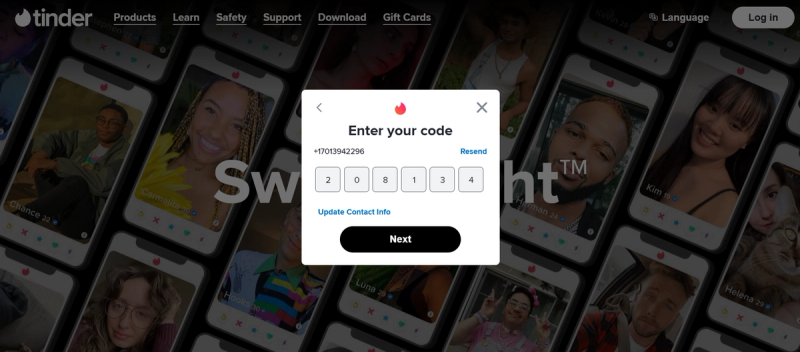 Go back to Tinder and enter the six-digit code exactly as it appears. The app confirms the number in a second and takes you to the next screen.