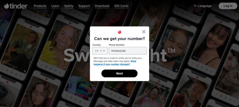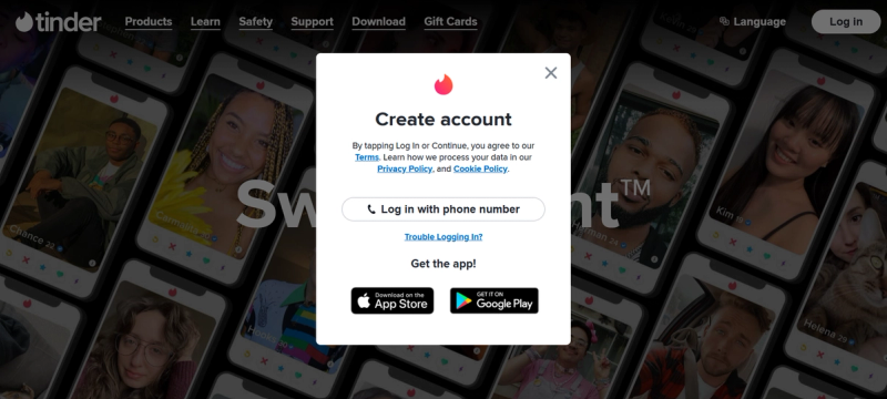 Download or open the Tinder app on your phone, or use the website on your computer. Choose “Create Account” and select the option to sign in or log in with a phone number.